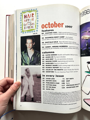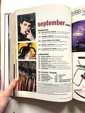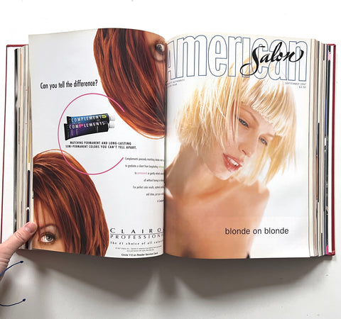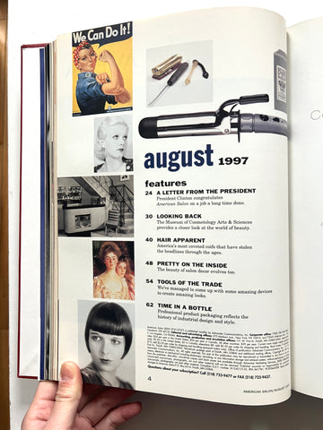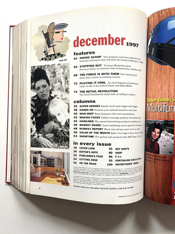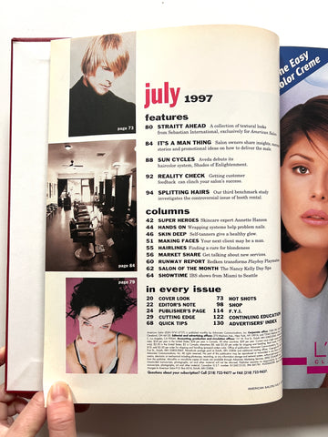6 monthly issues of beauty industry magazine American Salon in red leather library binding. Also includes bimonthly supplemental issues (Cut&Dry, International Expert). Great condition.