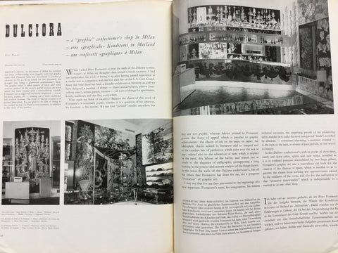 Attractive copy of this magazine devoted to the graphic arts, including a feature on A. M. Cassandre, Antoni Clave, features on commercial art in post war Germany, and a very interesting article, written by Gio Ponti, on the Milan pastry shop Dulciora designed by Gio Ponti with help from Fornasetti.