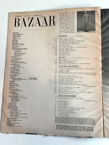 Hiro cover with George Halley dress. Neal Barr photographs Mainbocher fashions over several pages. Norman Norell. Galanos. Donald Brooks. Federico Forquet. Irene Galitzine. Yves Saint Laurent. Diane Arbus photographed  Mrs Martin Luther King. Gloria Guinness. Pablo Neruda. Robert Lax. White fur. Brassai. Bill King. One page with a closed tear. Light but general age-toning, creasing, handling wear. Rubbing, "dup" written on cover. binding dry. Index page loose.