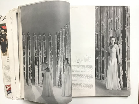 Cover by Marcel Vertes. Carmel Snow editor. Diana Vreeland fashion editor. Alexey Brodovich art director. George Hoyningen-Huene. Munkasci. Louise Dahl-Wolfe photographs at the Tony Wiiliam's house designed by Antonin Raymond. Clare Booth. Pajamas.